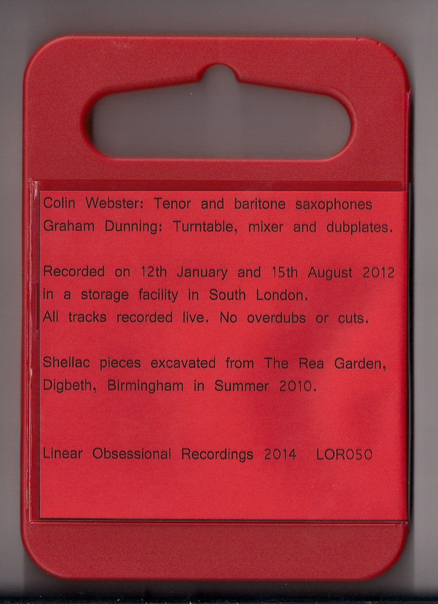 In the duo of Colin Webster and Graham Dunning, Colin improvises exploring a strict palette of minimal saxophone sounds, with an emphasis on breath and mechanical noises over "pure/natural" notes. No effects or external processing are applied to the saxophone sound. The aim is to produce sounds that could be interpreted the listener as synthetic or electronic in nature. Graham uses cheap DJ turntables and dubplates of his own field recordings, avoiding scratch DJ techniques in favour of a palette of noise, hum, crackle, drone and scraping sounds. In parts he also plays the platter itself, the case and lid, and employs brushes, dentistry tools and pencils in sound making.